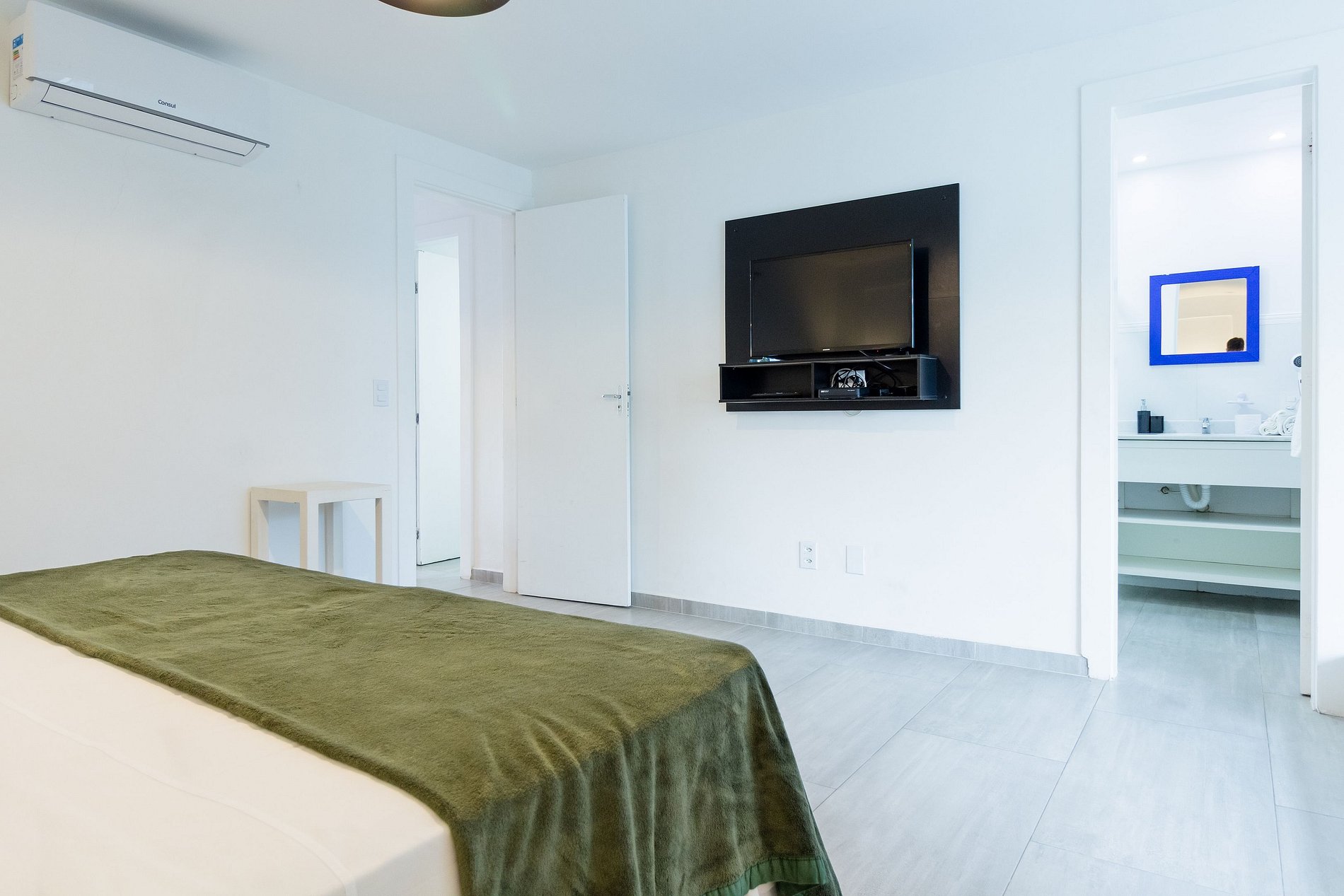 O apartamento conta com espaço integrado entre sala de tv, sala de jantar e cozinha. Tudo em ambiente agradável e climatizado com ar condicionado split. Na sala há ainda um sofá cama de casal que pode vir a ser utilizado com certo conforto, acomodando até 04 hóspedes no apartamento. Já a suíte possui cama king size, ar condicionado, Tv, armário e uma agradável varanda.