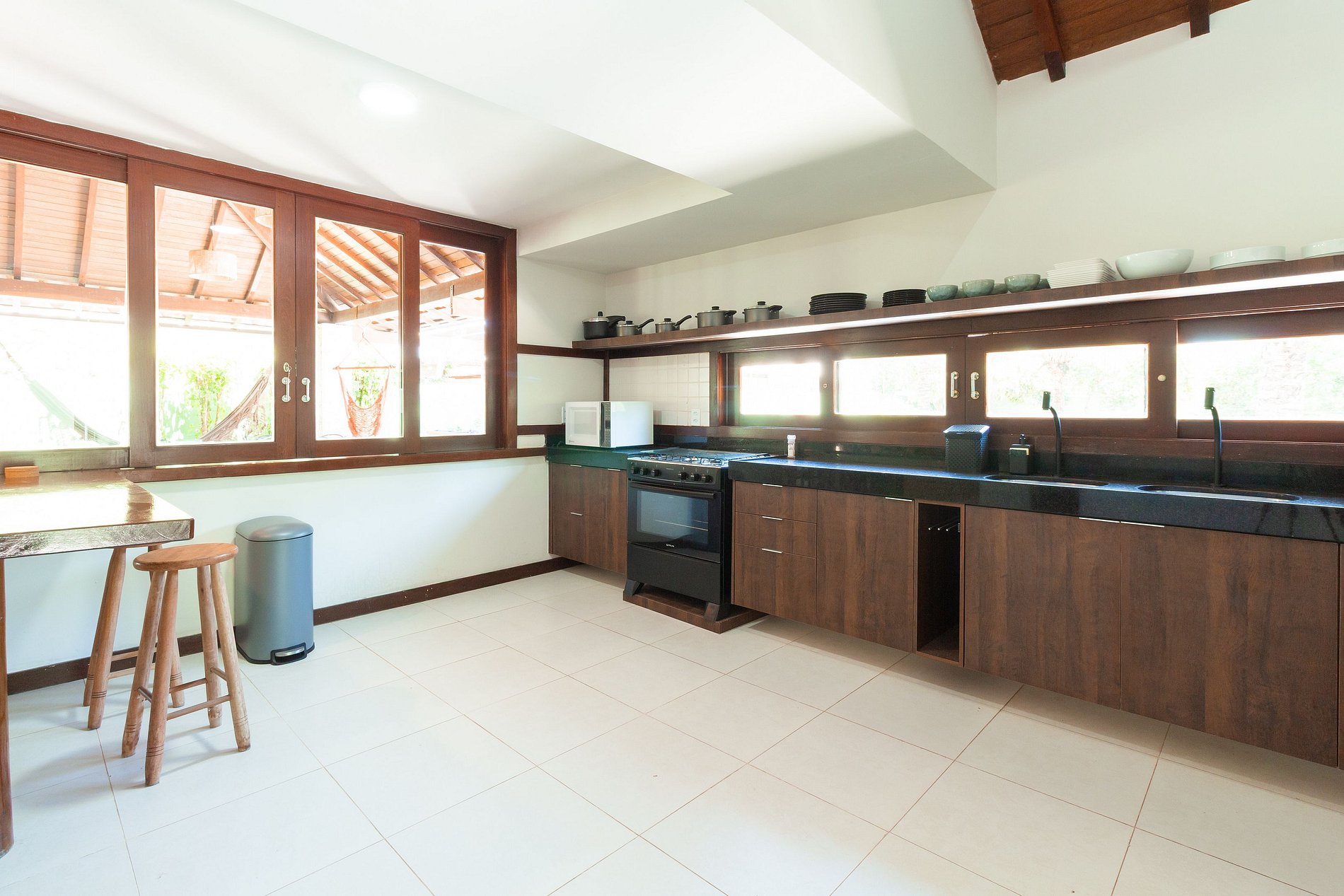 Casa planejada para oferecer espaços amplos que se conectam e garantem maior integração e bem-estar aos hóspedes. A sala ampla, a cozinha e a sala de jantar se integram para formar um ambiente arejado e banhado por luz natural.