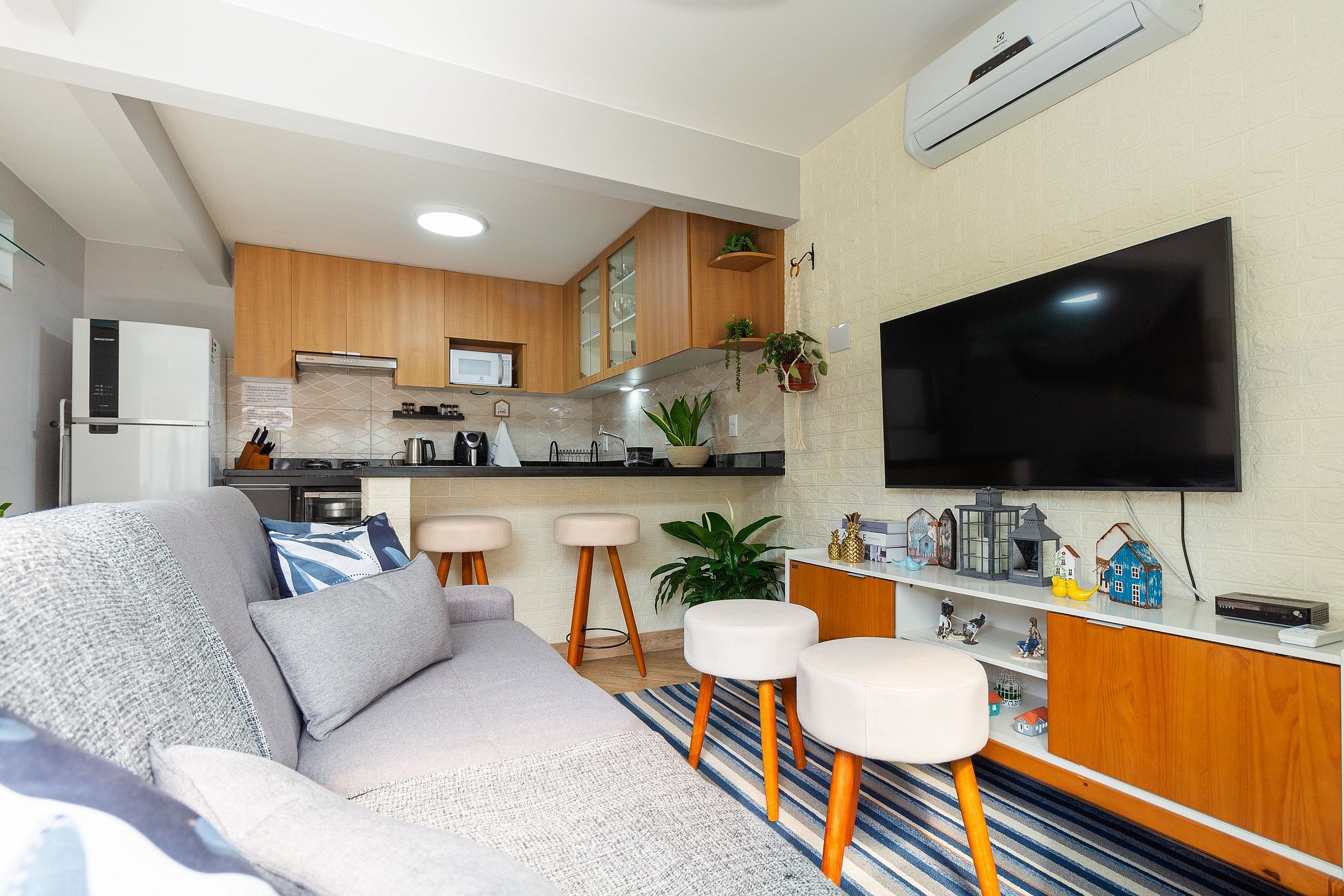Flat de 1 quarto com ar condicionado e ventilador de teto, banheiro, cozinha completa, w-fi, sala decorada com ar, TV Smart com Netflix e Globo Play.