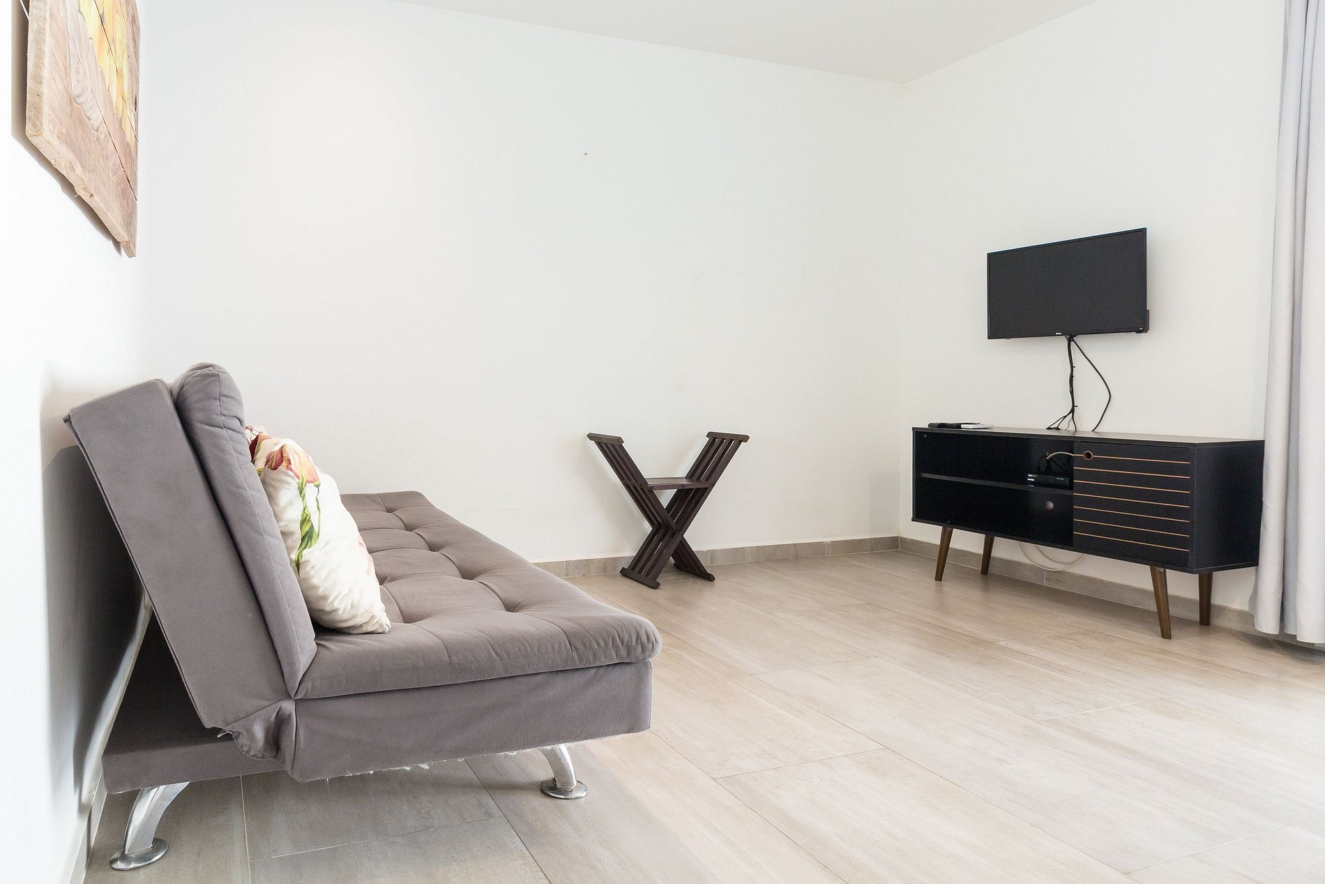 O apartamento conta com espaço integrado entre sala de tv, sala de jantar e cozinha. Tudo em ambiente agradável e climatizado com ar condicionado split. Na sala há ainda um sofá cama de casal que pode vir a ser utilizado com certo conforto, acomodando até 04 hóspedes no apartamento. Já a suíte possui cama king size, ar condicionado, Tv, armário e uma agradável varanda.
