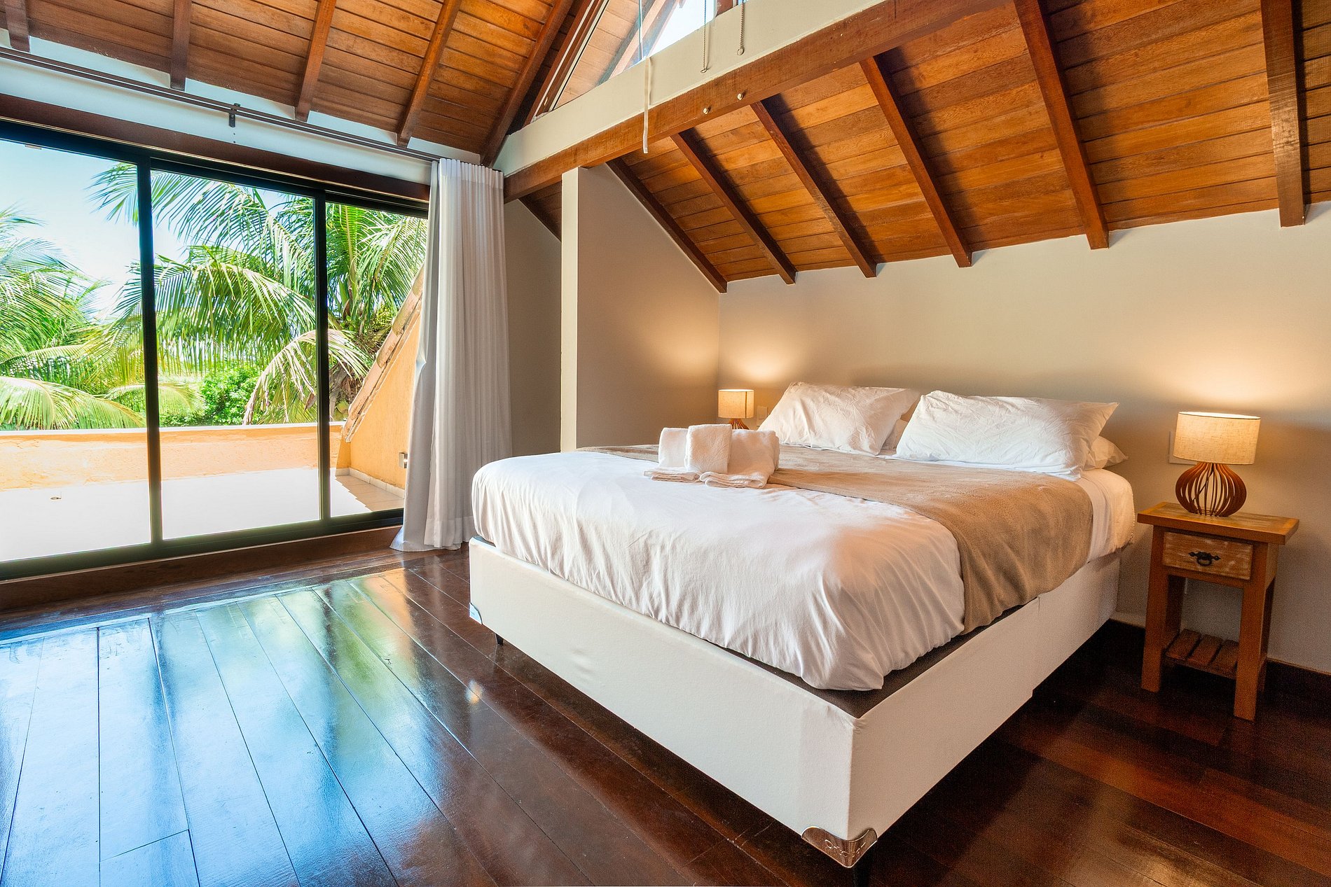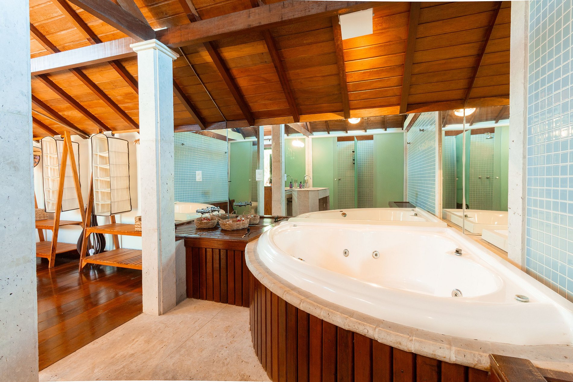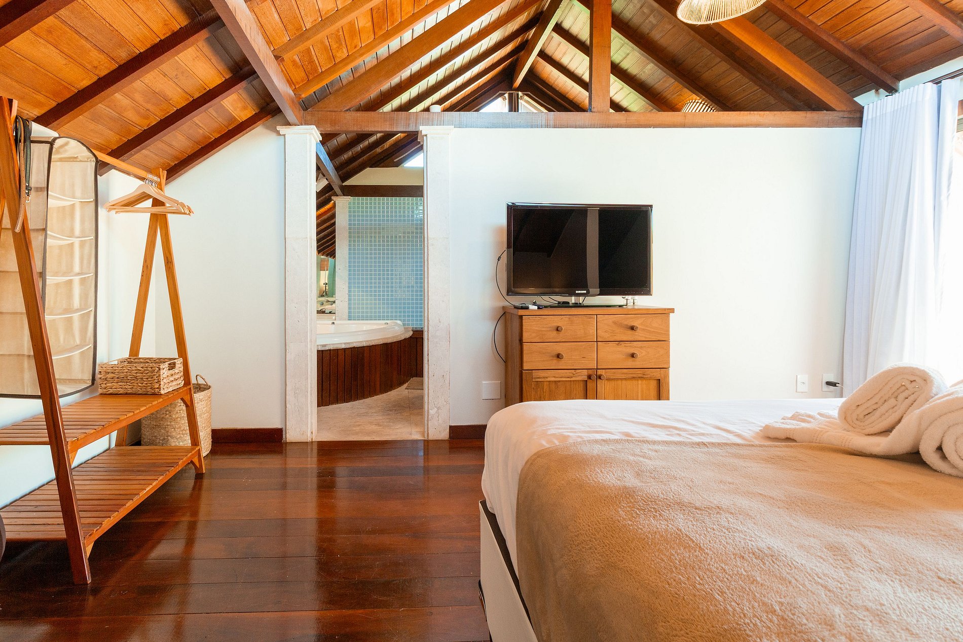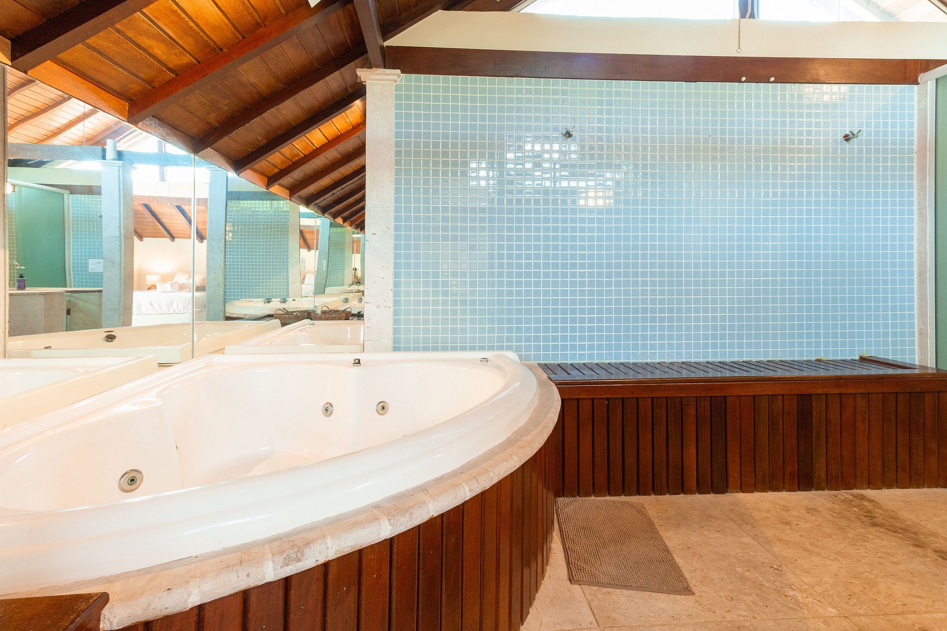 - 1 suíte no segundo andar com ar condicionado, TV com acesso a internet e banheira de hidromassagem.