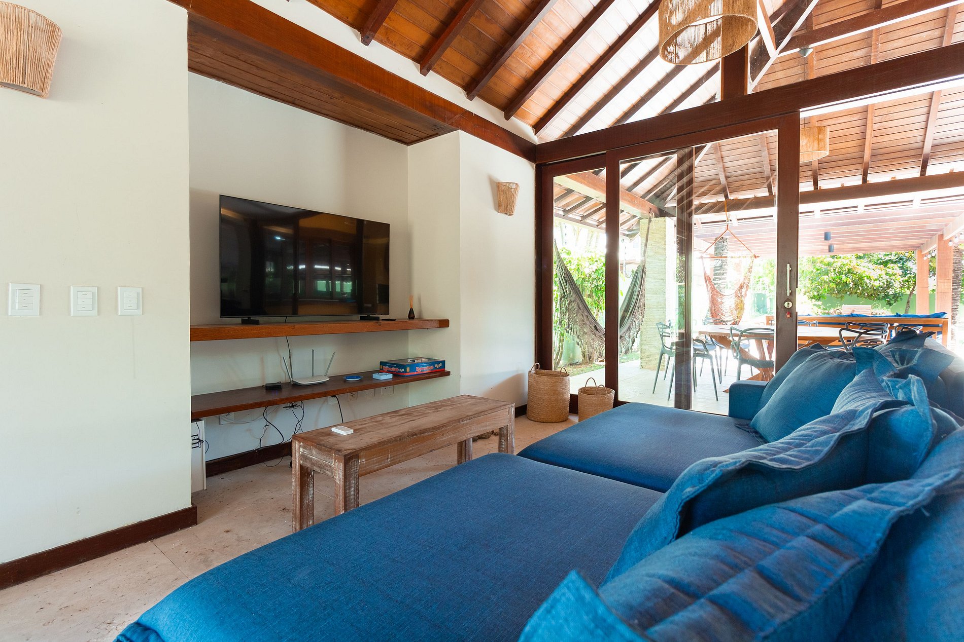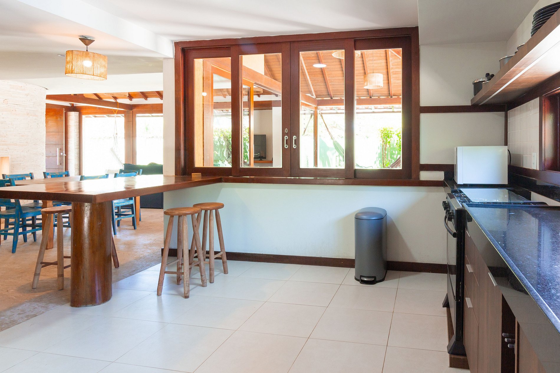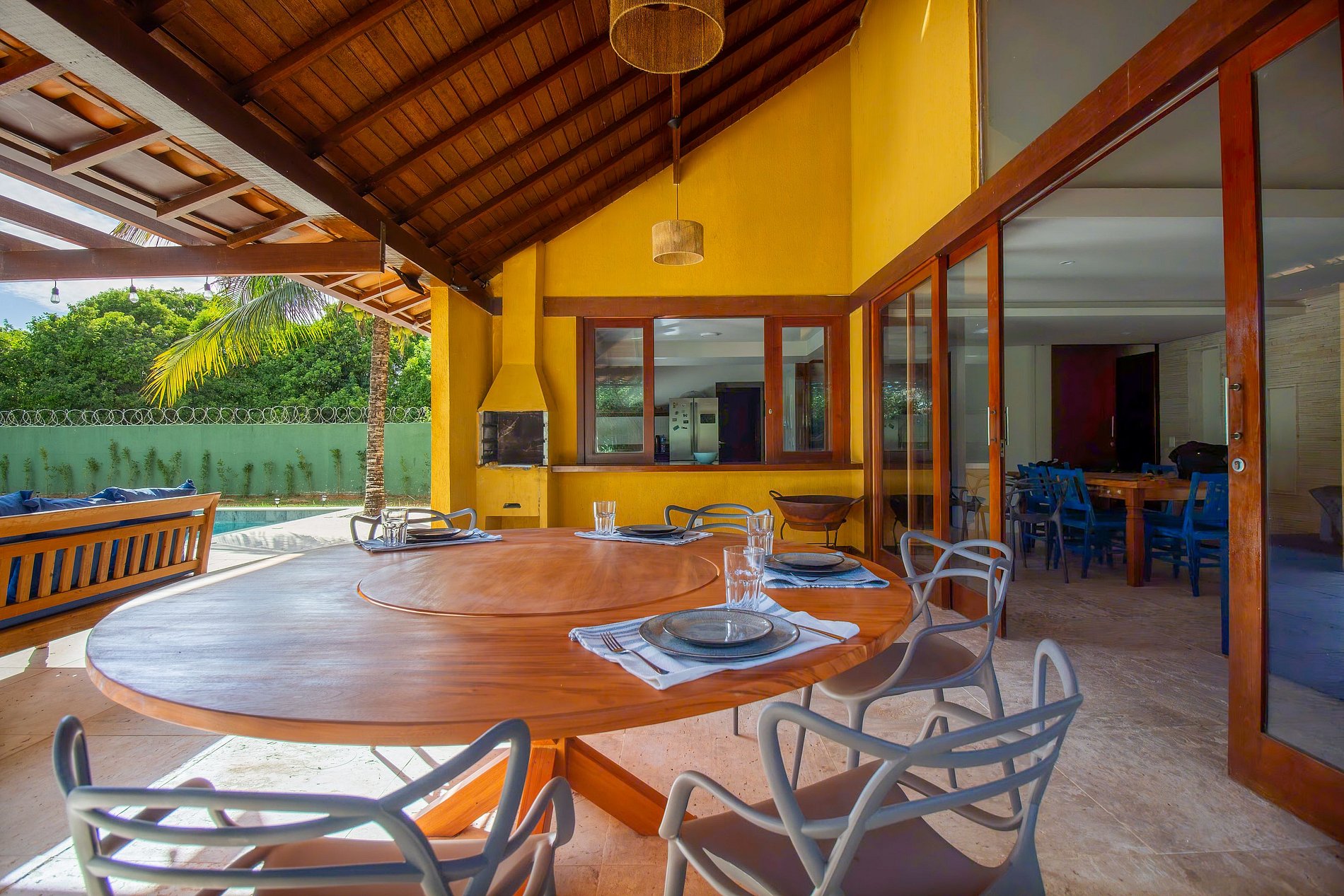Casa planejada para oferecer espaços amplos que se conectam e garantem maior integração e bem-estar aos hóspedes. A sala ampla, a cozinha e a sala de jantar se integram para formar um ambiente arejado e banhado por luz natural.