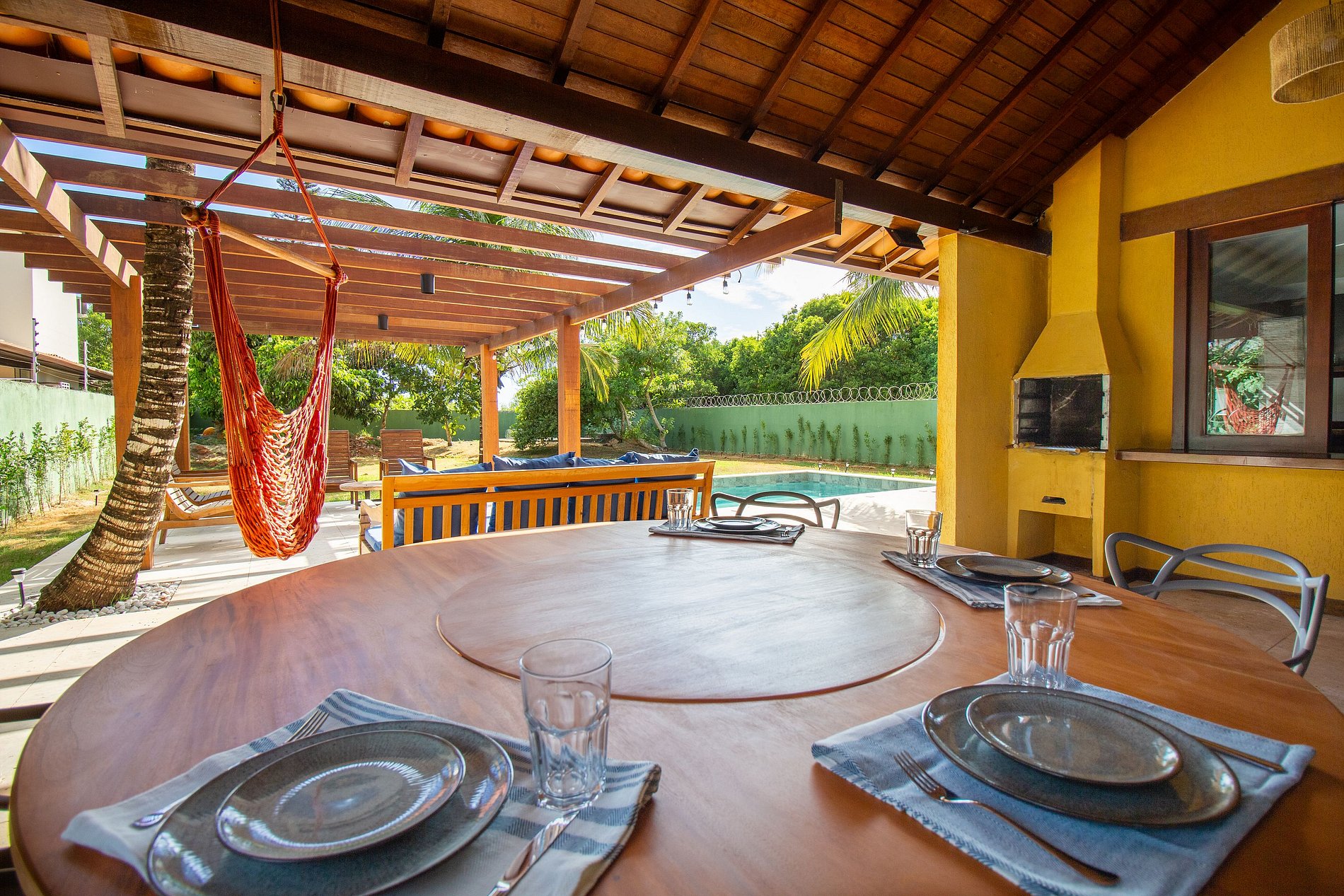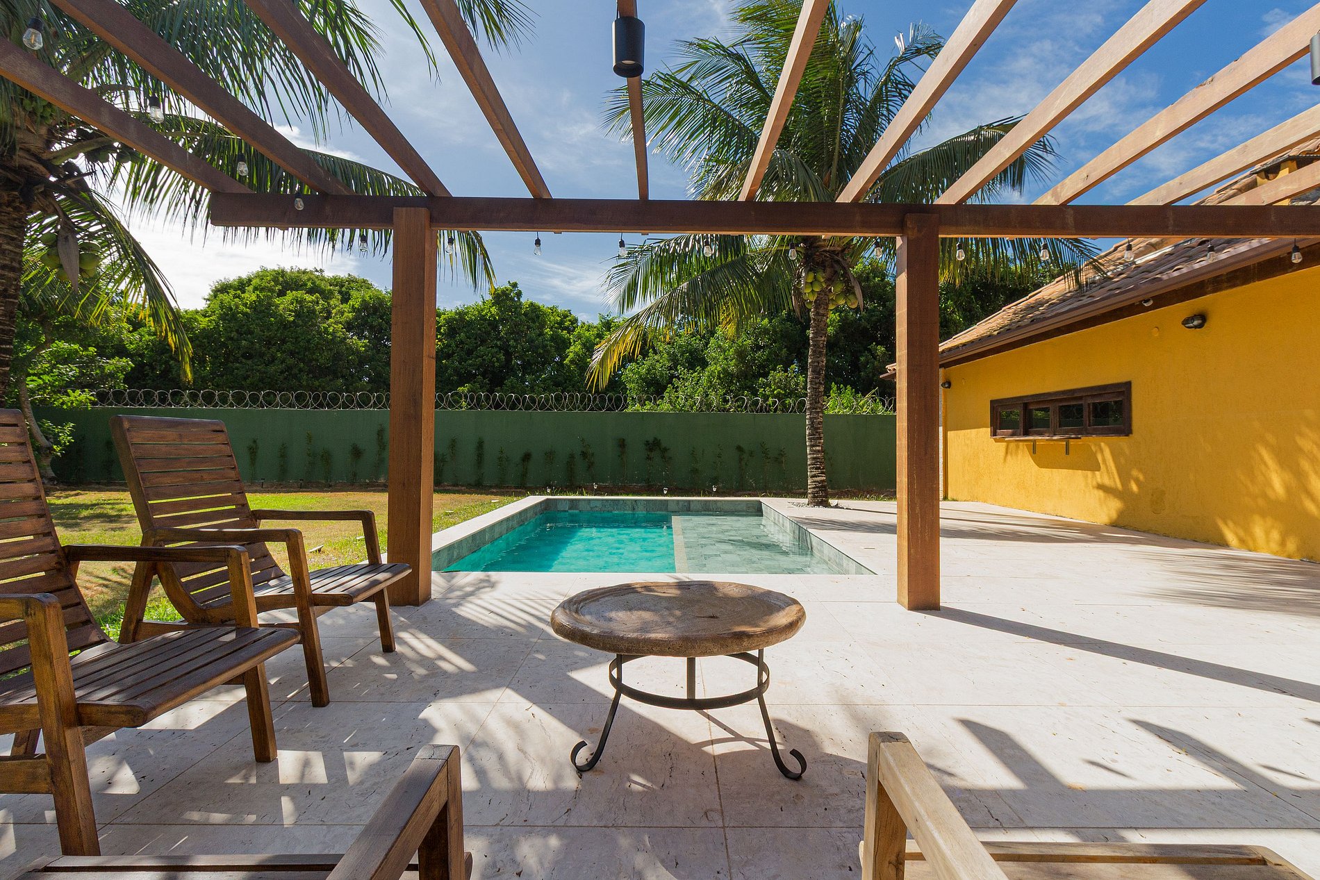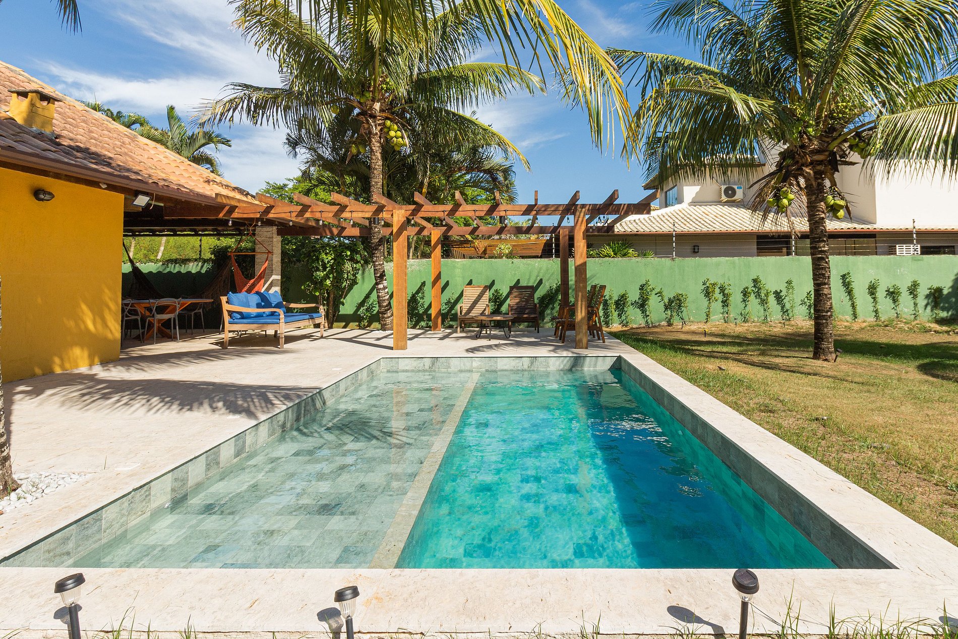 - Área externa com piscina privativa, pergolado, churrasqueira e grande mesa para refeições em família. Grama e árvores frutíferas.