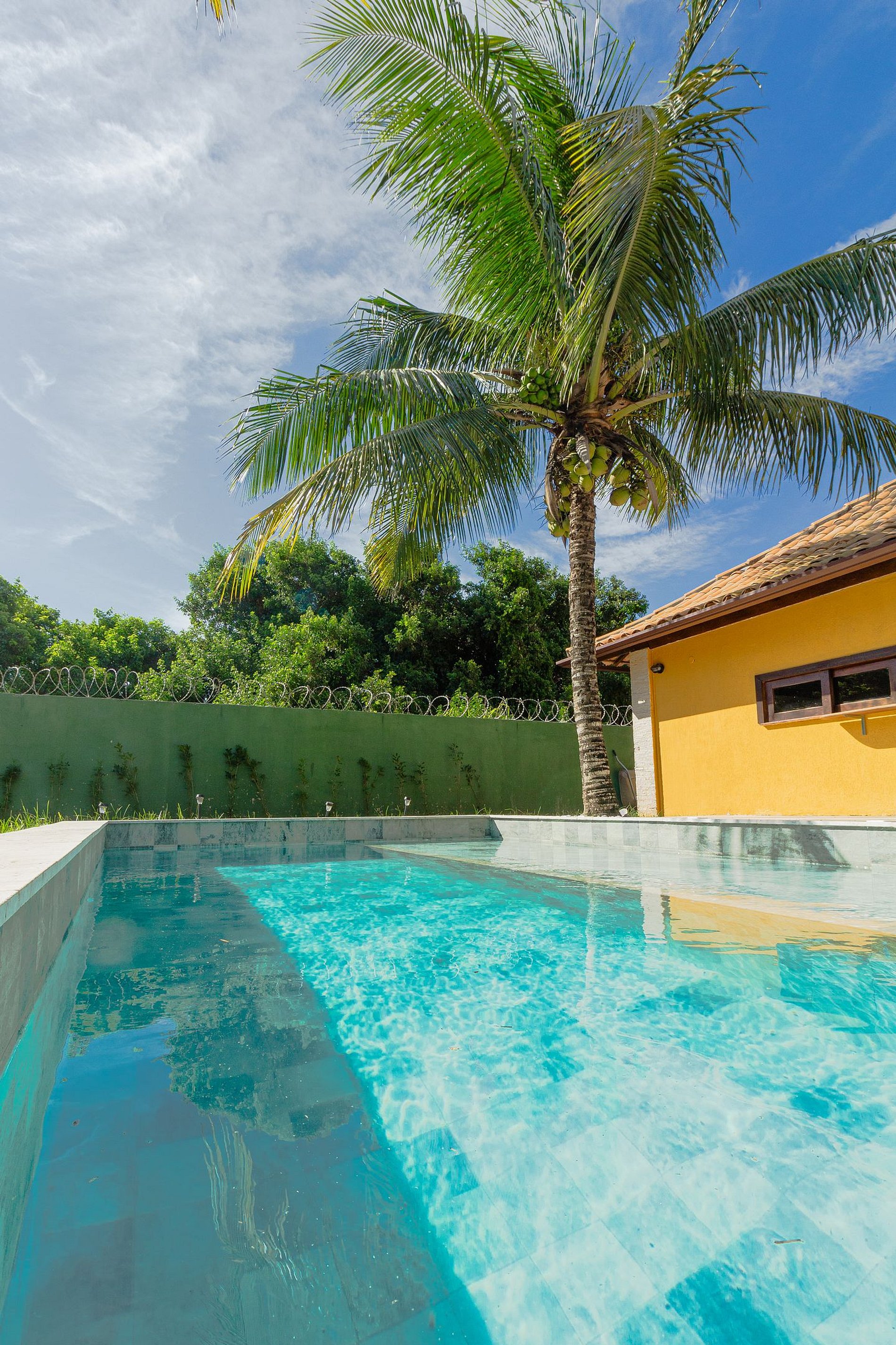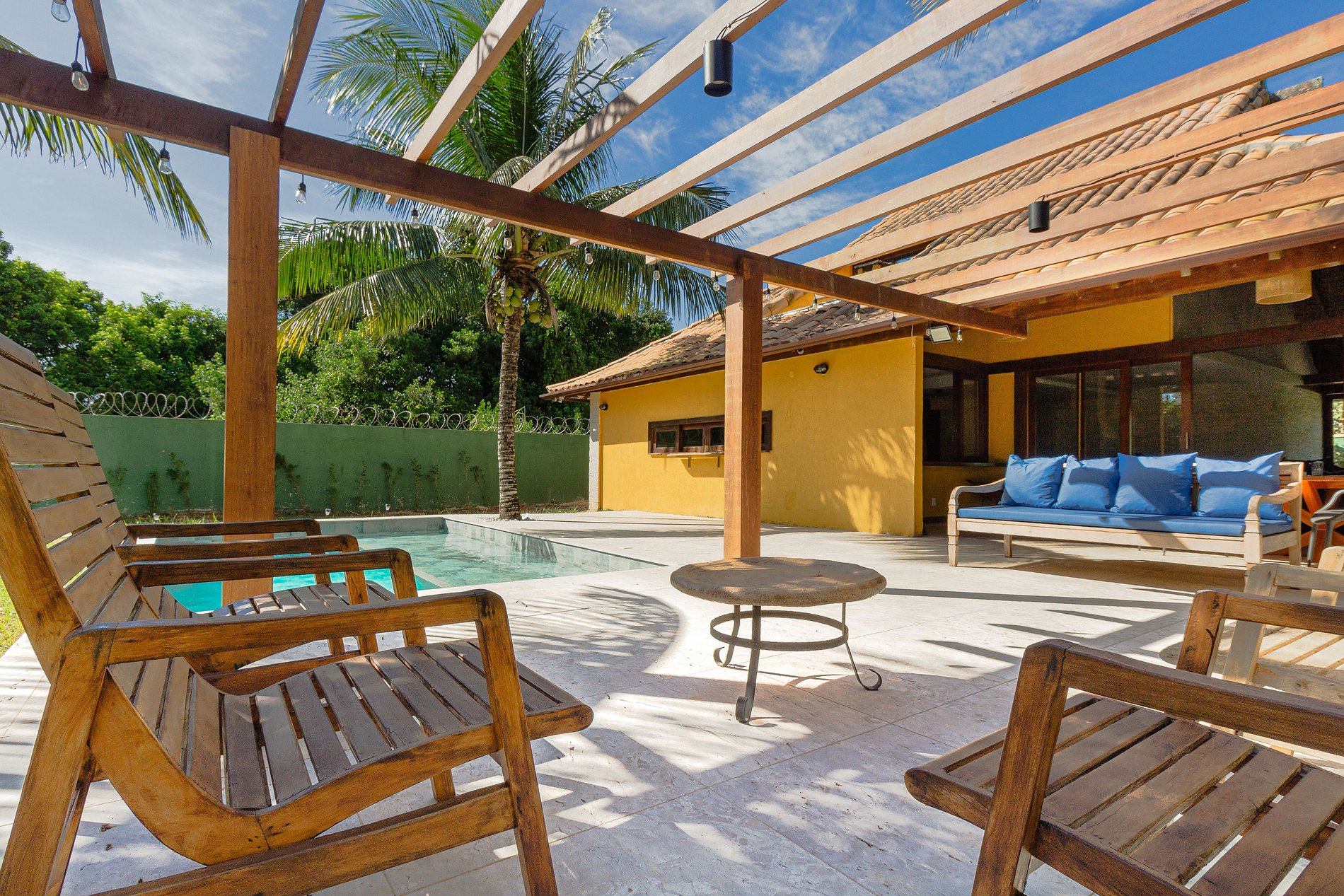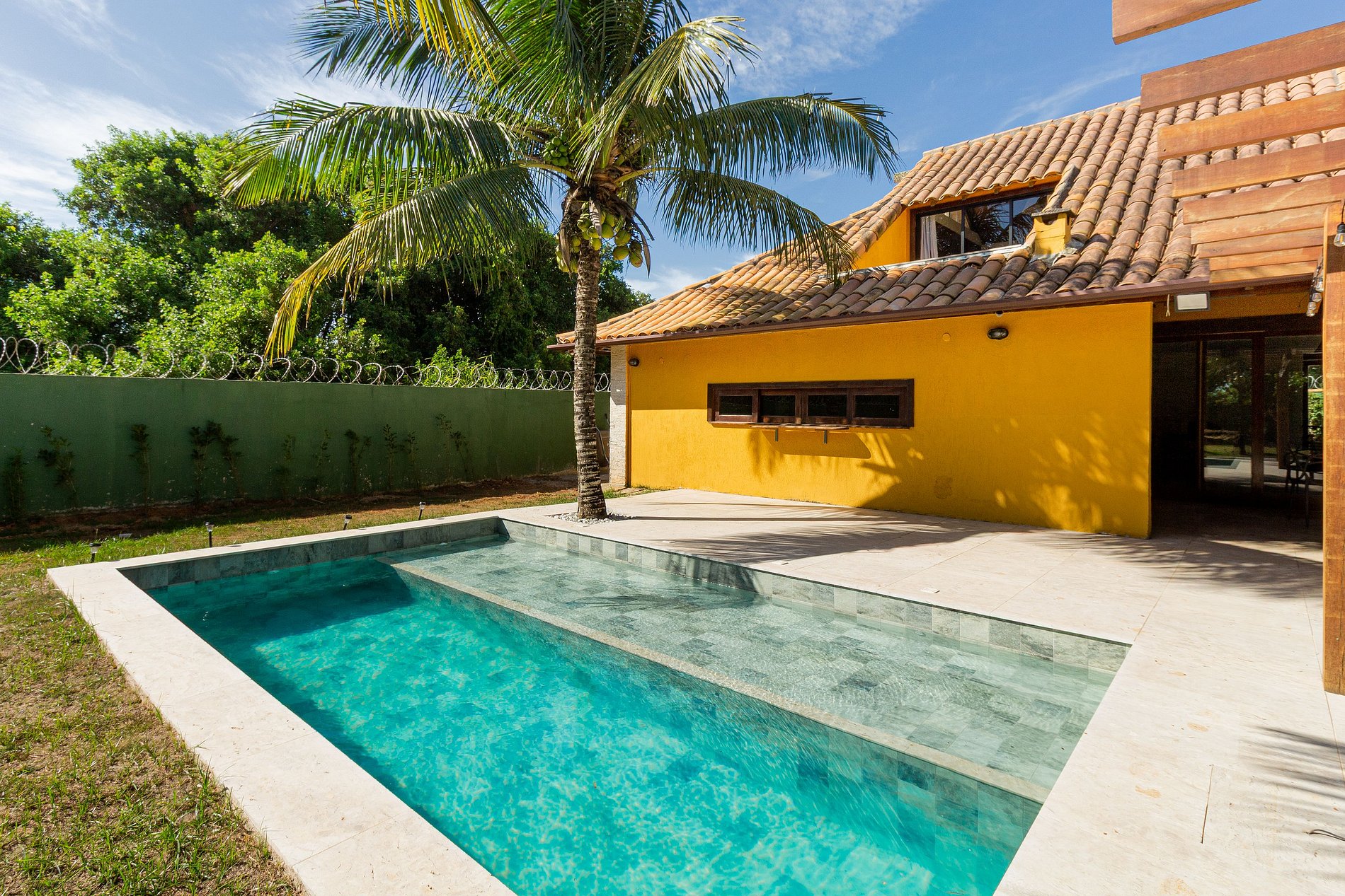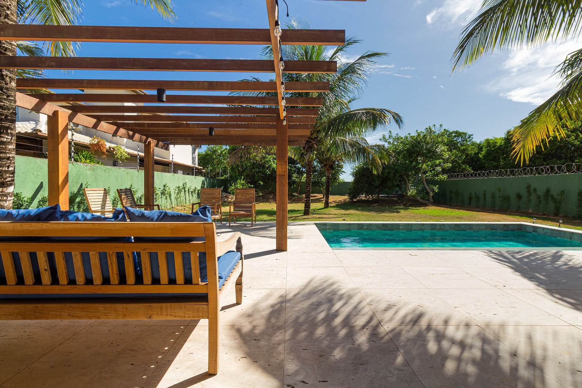 - Área externa com piscina privativa, pergolado, churrasqueira e grande mesa para refeições em família. Grama e árvores frutíferas.