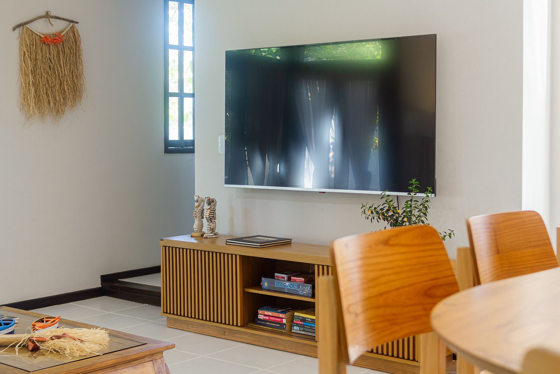 Sala: Sala de TV e sala de jantar integradas (mesa com 8 cadeiras), com decoração acolhedora, Smart TV de 65 polegadas e um confortável sofá-cama.