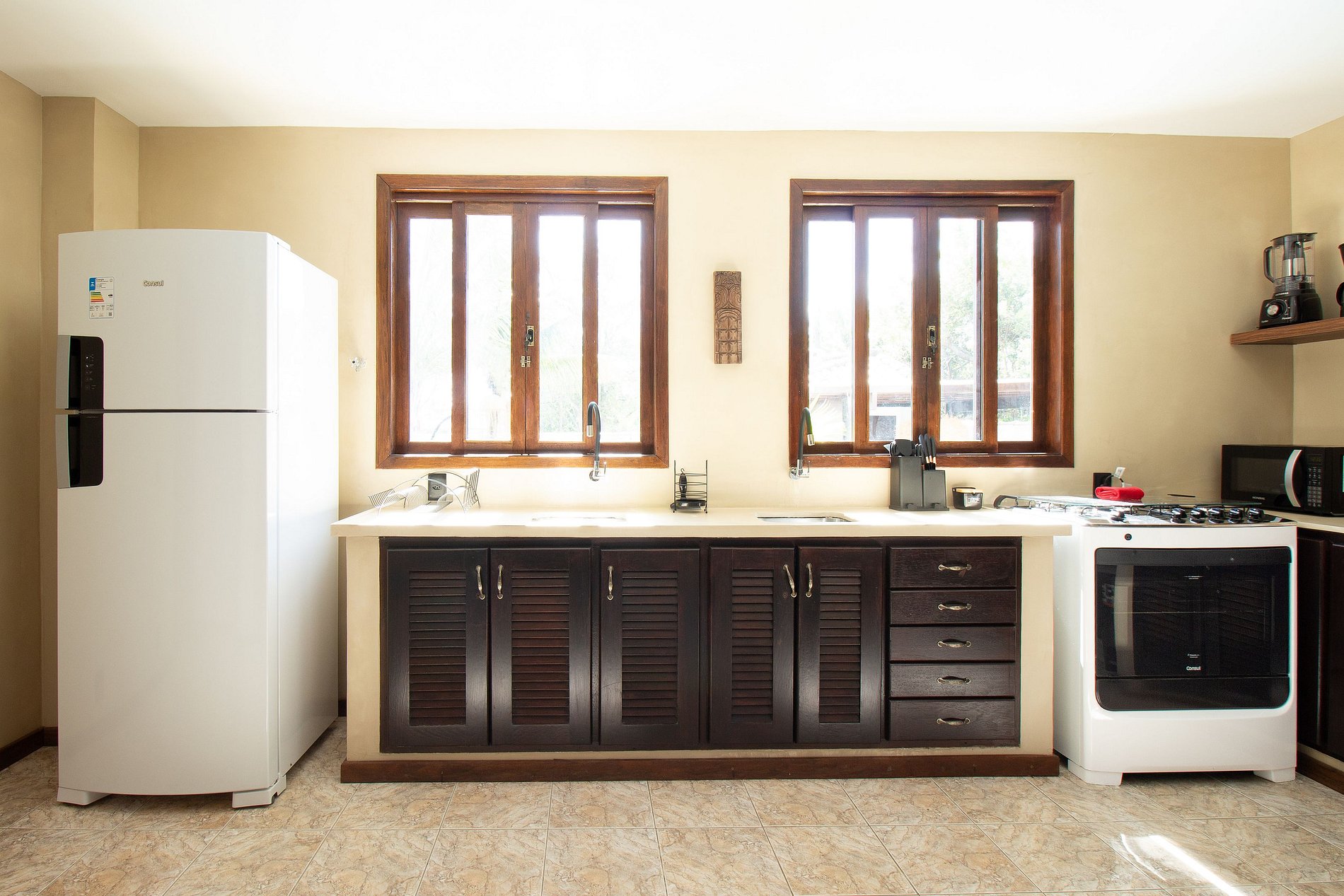 Cozinha: geladeira, fogão e forno a gás, microondas, cafeteira elétrica, liquidificador, sanduicheira e utensílios de cozinha.