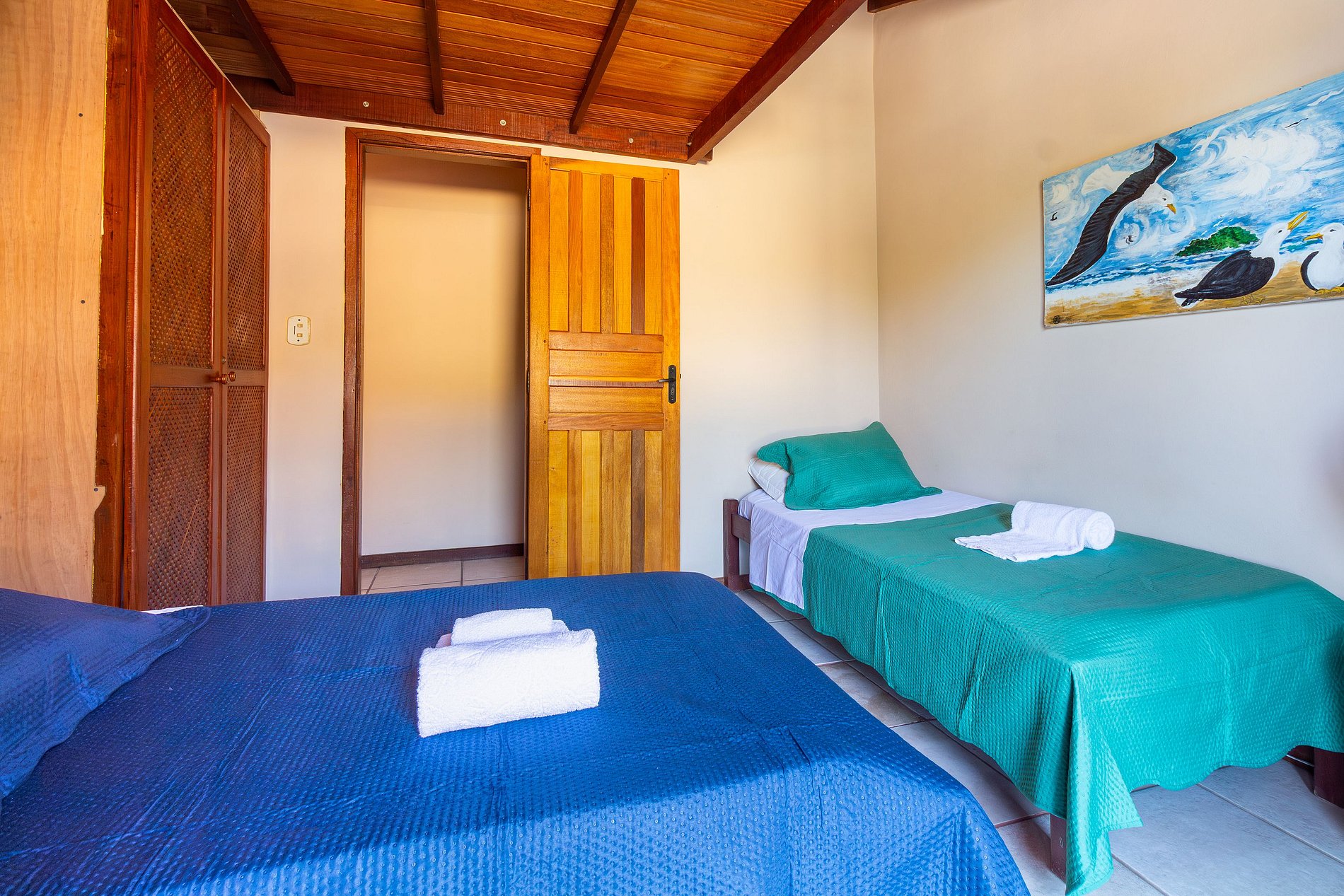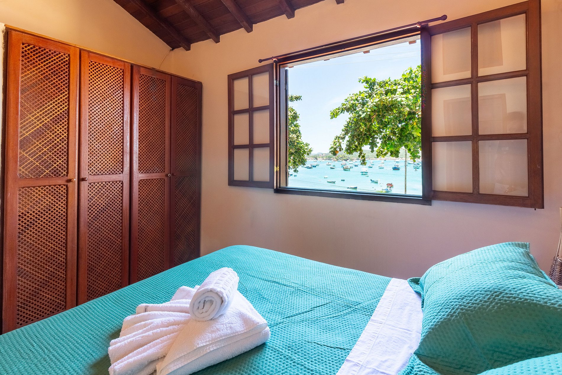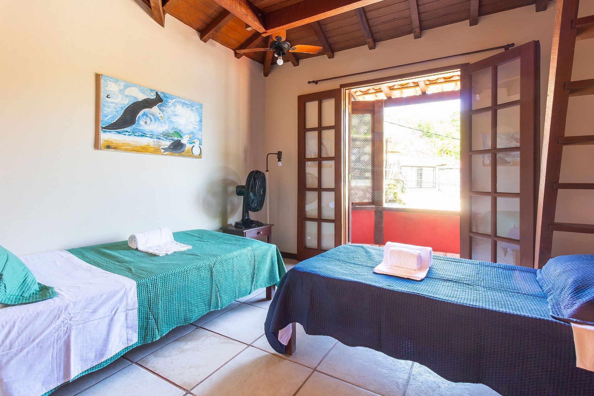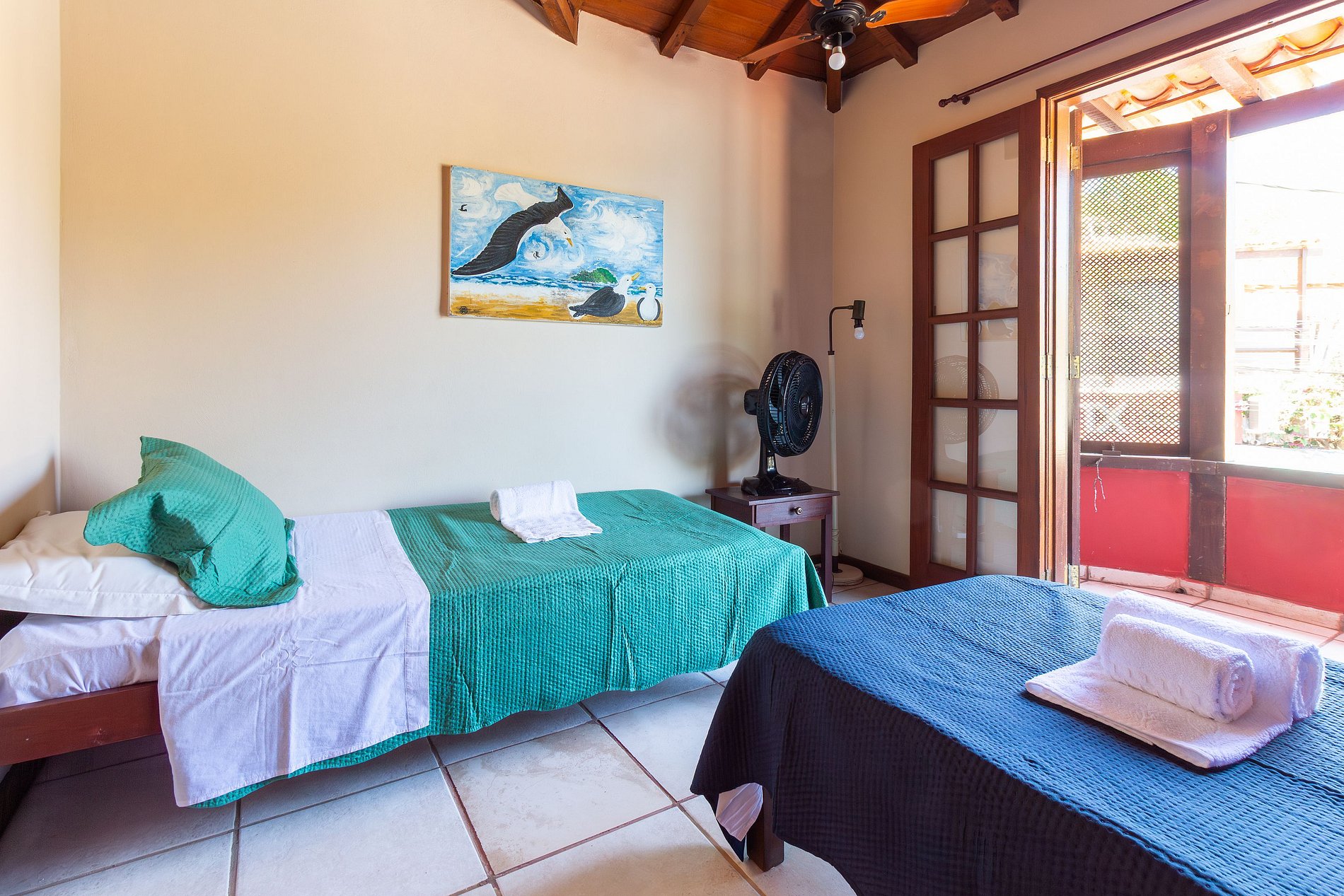 - Quarto duplo composto por duas camas de solteiro, ventilador de teto e varanda com vista para a Orla Bardot e Praia da Armação.