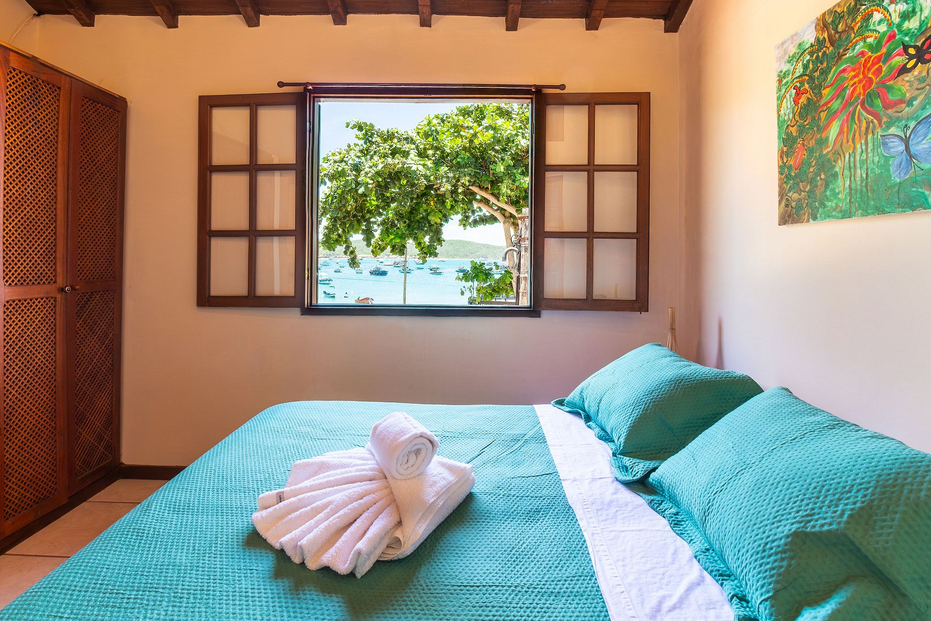 - Suíte com cama de casal, armário embutido e ventilador de teto. Possui vista para a Praia da Armação e Orla Bardot.