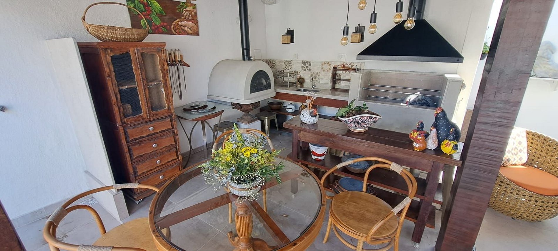 Habitação com 2 suítes, ar condicionado, TV, lavabo, sala, cozinha conceito aberto- equipada, pequena área de serviço, área gourmet com churrasqueira, forno à lenha, rede pra descanso, ducha, garagem compartilhada.