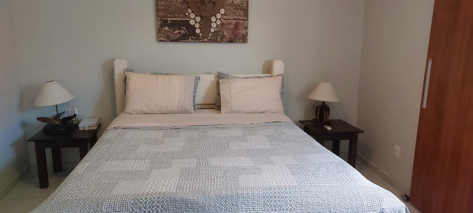 Habitação com 2 suítes, ar condicionado, TV, lavabo, sala, cozinha conceito aberto- equipada, pequena área de serviço, área gourmet com churrasqueira, forno à lenha, rede pra descanso, ducha, garagem compartilhada.