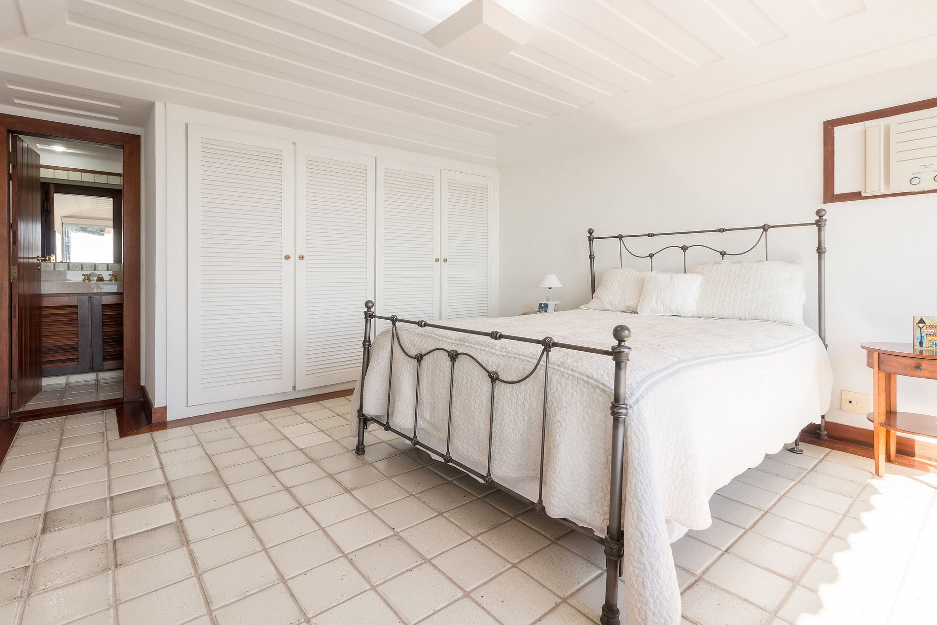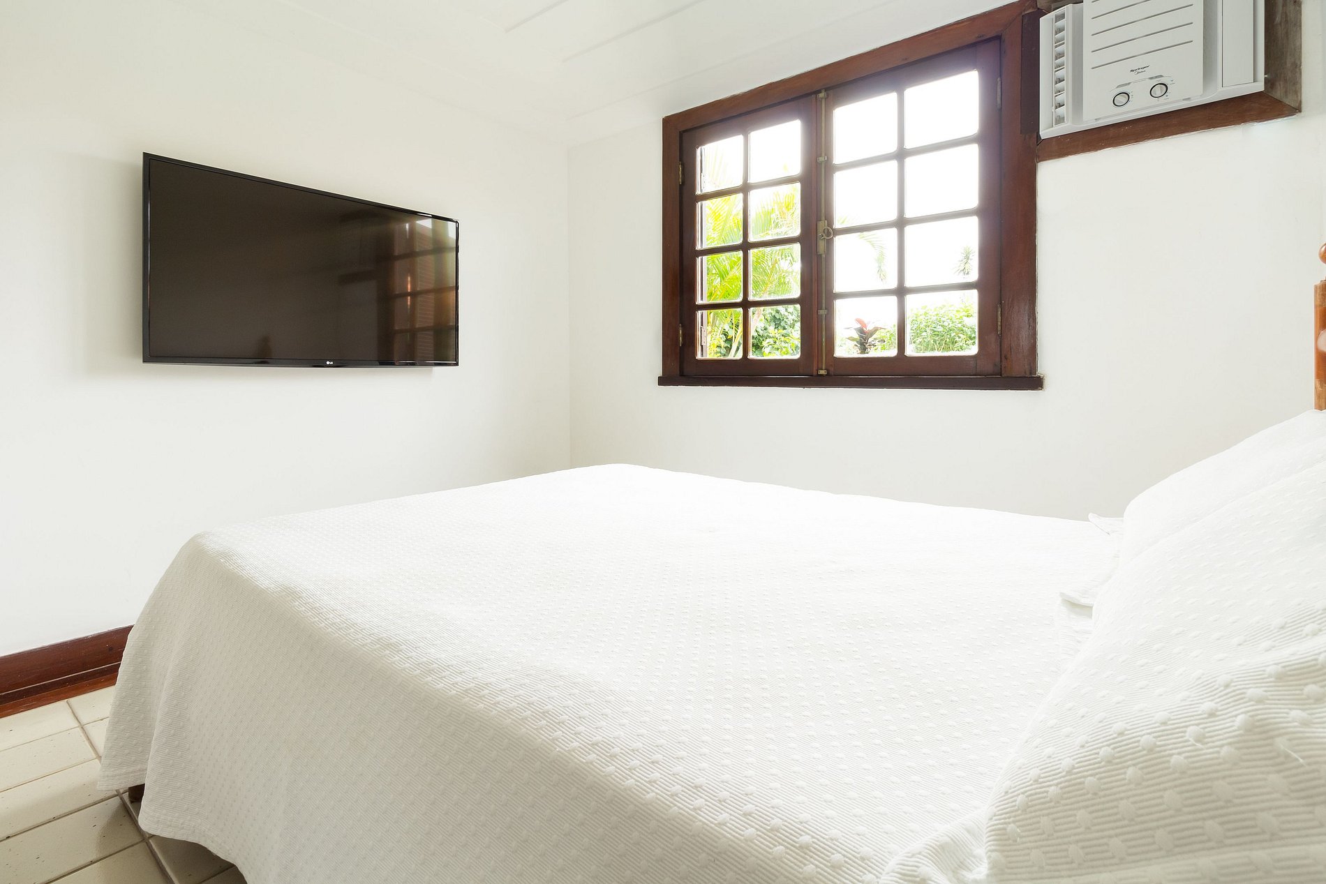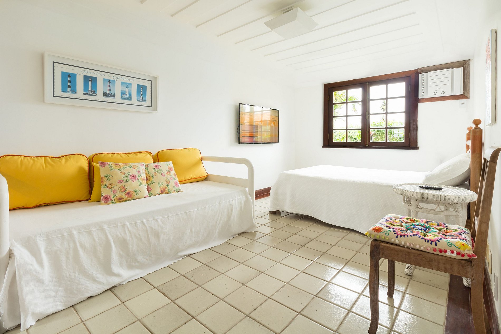 - Suíte com cama de casal, ar-condicionado, armário e vista para o jardim.