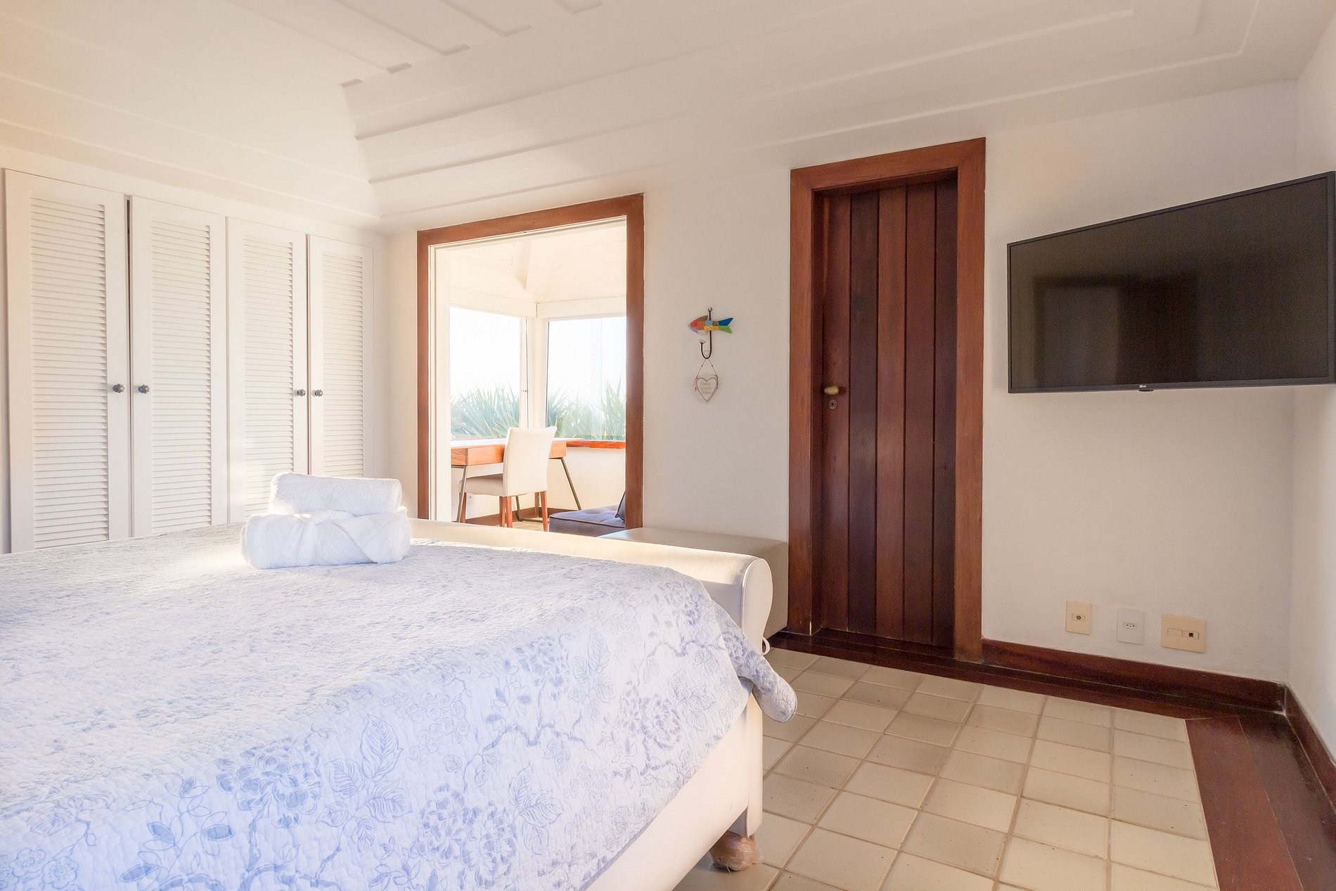 - Suíte com cama Queen Size, ar-condicionado, Smart TV, armário e estação de trabalho, com excelente vista para o mar.