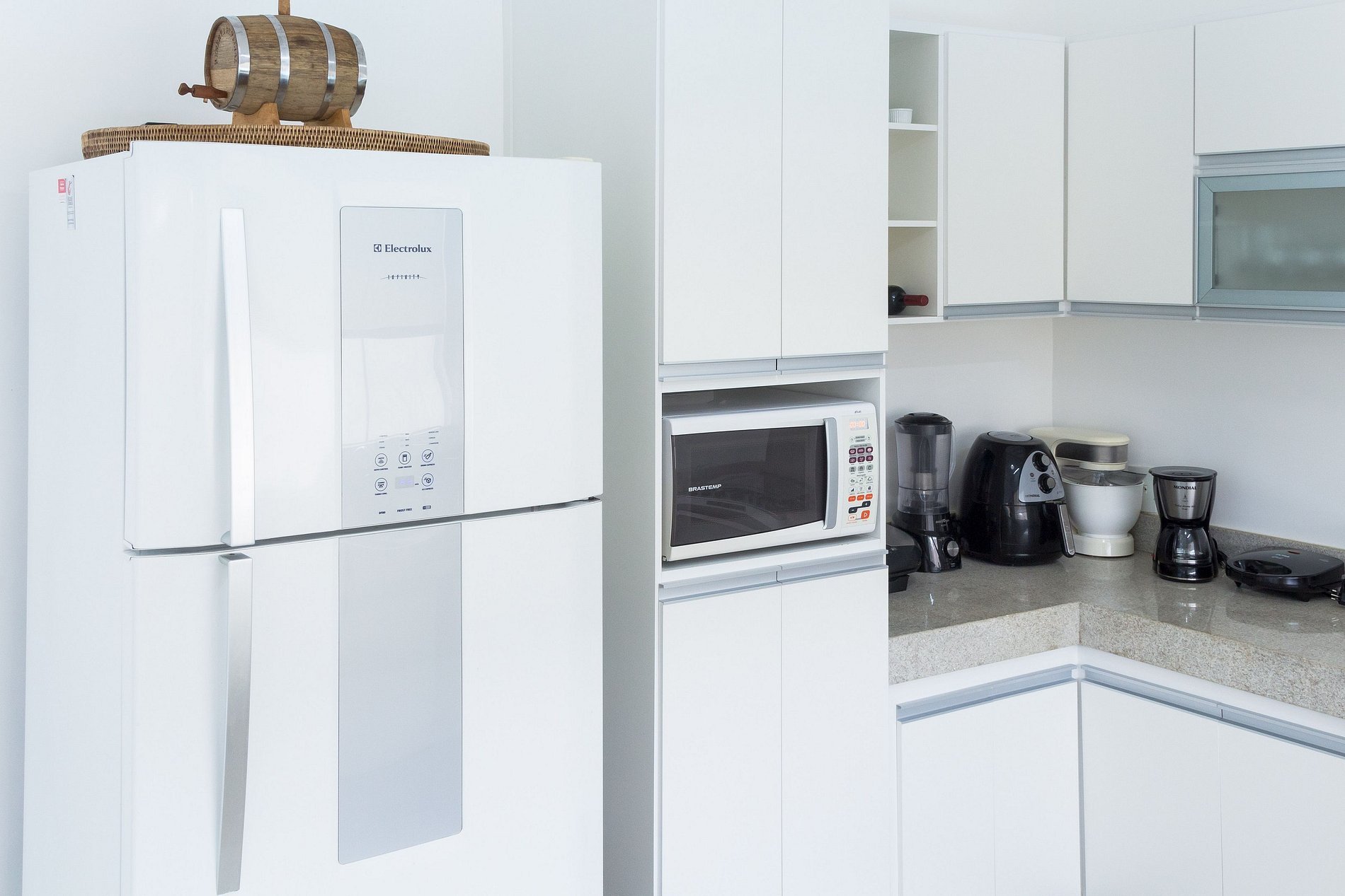 Sala ampla, com 2 ventiladores de teto, TV de tela plana e sofá retrátil. Cozinha planejada, com mesa de seis lugares, geladeira, micro-ondas, grill, liquidificador, batedeira, air fryer, espremedor de frutas, sanduicheira, mixer e todos os utensílios para preparar as refeições.