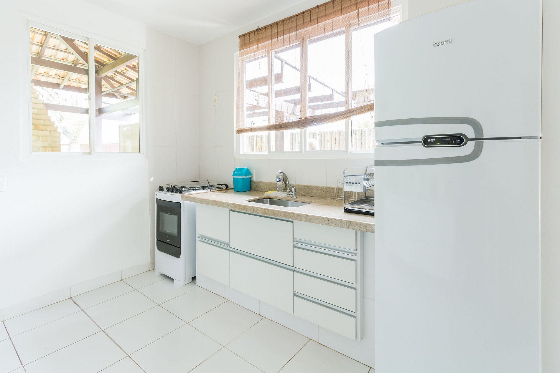 Possui 1 suíte, 2 quartos, 1 banheiro social entre os quartos e mais 1 banheiro social depois da área de serviço, próximo ao quintal e área gourmet. Sala de televisão e jantar integradas, cozinha e área de serviço. Ar condicionado em todos os quartos, Ventilador de teto nos quartos e sala. Cozinha equipada para realizar refeições.