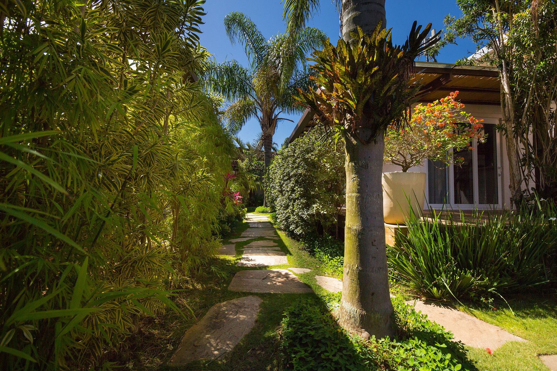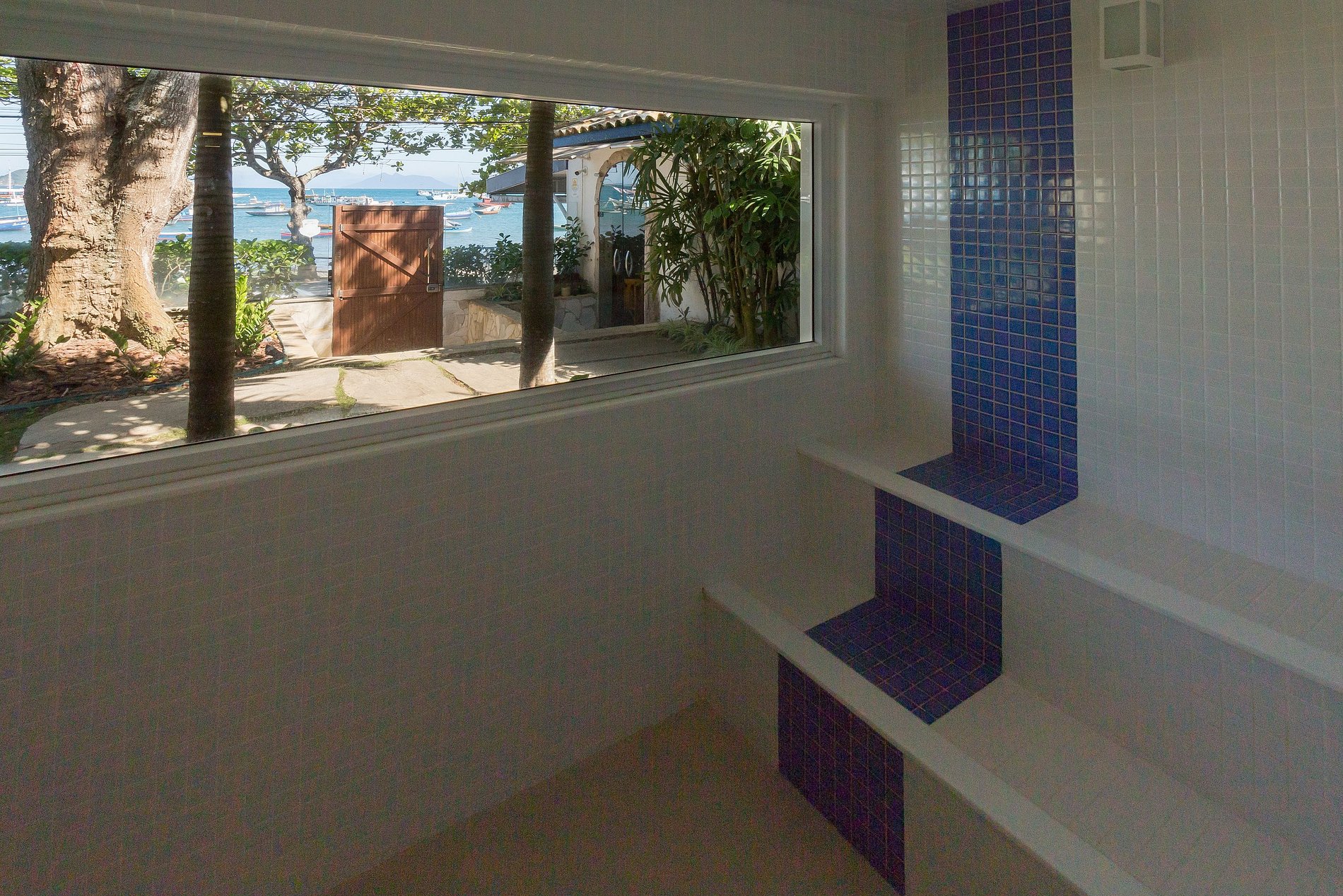 O acesso ao condomínio é feito por pequenos lances de escada, seja pelo portão da Orla Bardot quanto pelo acesso da garagem. A entrada da casa possui ainda um lance de dois degraus, que dá acesso ao deck de madeira.