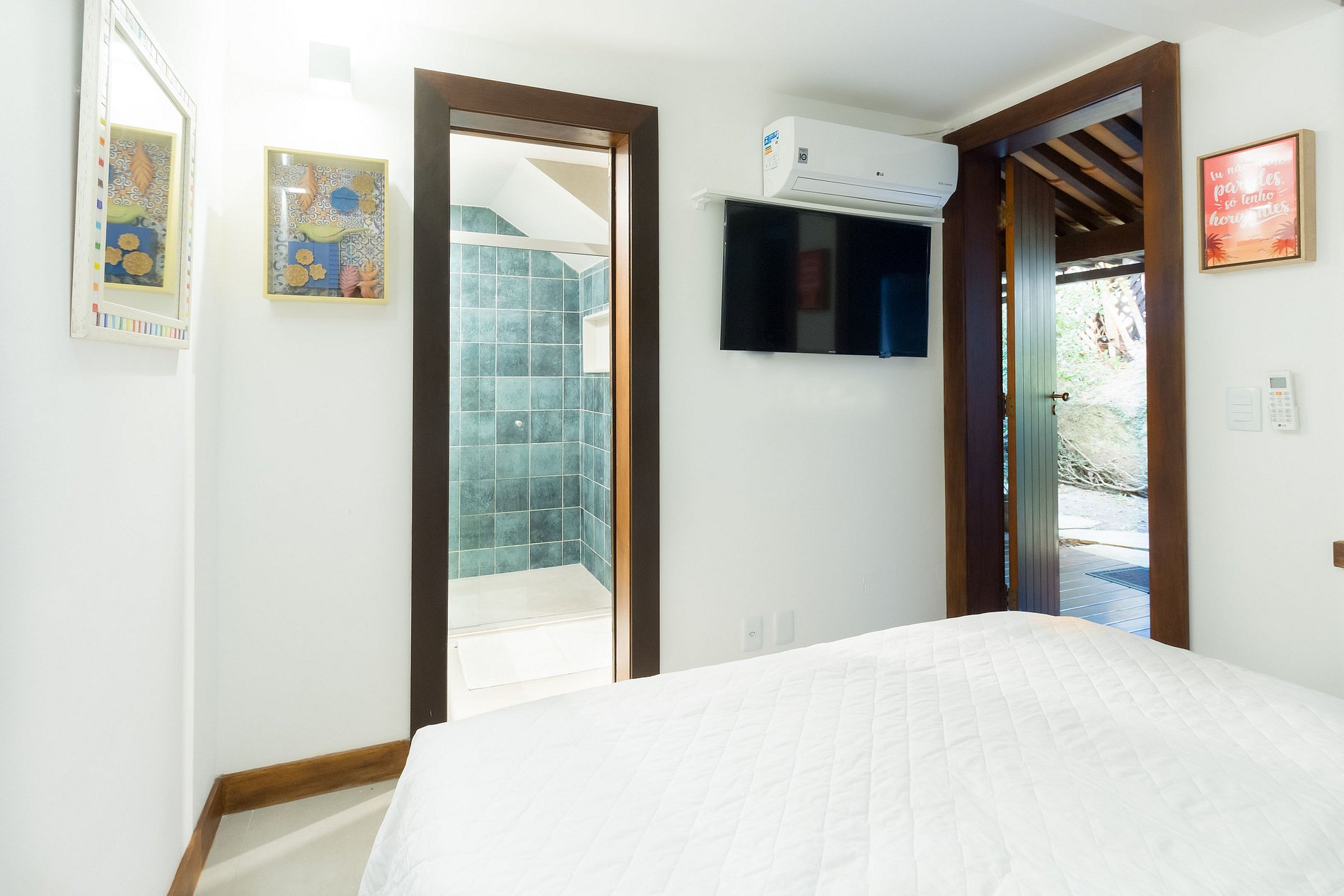 - Suíte com cama Queen Size, ar-condicionado split, armário, Smart TV e estação de trabalho, com vista espetacular para o mar.